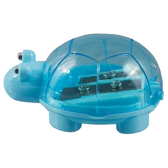 Доброго времени суток ,приобретала точилку для школы .Точу с помощью неё как простые,так и цветные карандаши разной мягкости.Точилка сплавляется со своими функциями на ура.Карандаши не портит ,точит остренько .Имеет форму черепашки ,в панцире которой хранится струшка.Места для страшно много ,поэтому не обязательно часто ее чистить .Крепиться панцирь плотно ,мусор не разбросается в пенале . Сделана черепашка и качественно пластика,синего приятного цвета .