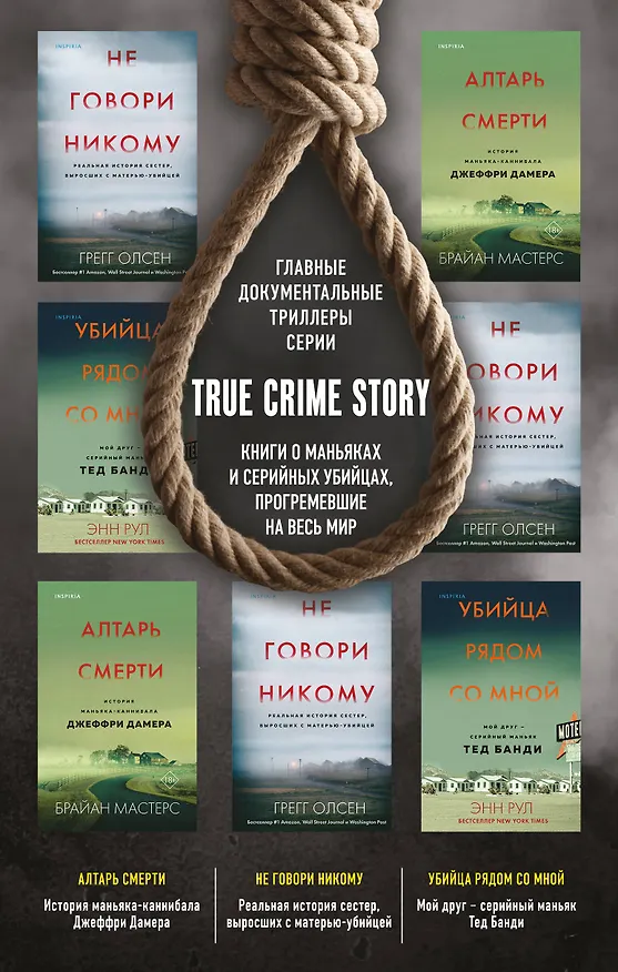 Комплект психологических триллеров серии True Crime Story — истории, прогремевшие на весь мир: «Не говори никому. Реальная история сестер, выросших с матерью-убийцей», «Убийца рядом со мной. Мой друг — серийный маньяк Тед Банди», «Алтарь смерти. История маньяка-каннибала Джеффри Дамера». Откровенные и шокирующие биографии серийных убийц, которые буквально приковывают к страницам.