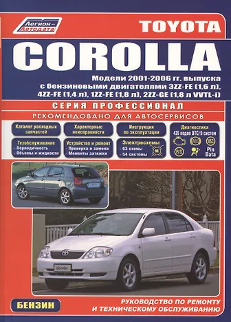 В руководстве дается пошаговое описание процедур по эксплуатации, ремонту и техническому обслуживанию автомобилей Toyota Corolla с 2001 г. выпуска, оборудованных бензиновыми 3ZZ-FE (1,6 л), 4ZZ-FE (1,4 л), 1ZZ-FE (1,8 л), 2ZZ-GE (1,8 л WTL-i) двигателями.Издание содержит подробные сведения по ремонту и регулировке элементов системы управления бензиновыми двигателями, система изменения фаз газораспределения и высоты подъёма клапанов (VVTL-i), инструкции по использованию системы самодиагностики АКПП ABS и ЭУР и рекомендации по регулировке и ремонту автоматических коробок передач, элементов тормозной системы (включая ABS), рулевого управления и подвески. Представлены подробные электросхемы.Прив