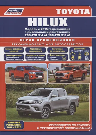 Руководство по ремонту Toyota Hilux с 2015 года выпуска, оборудованных дизельными двигателями 2GD-FTV (2,4 л), 1GD-FTV (2,8 л), включая рестайлинговые модели с 2017 года выпуска.