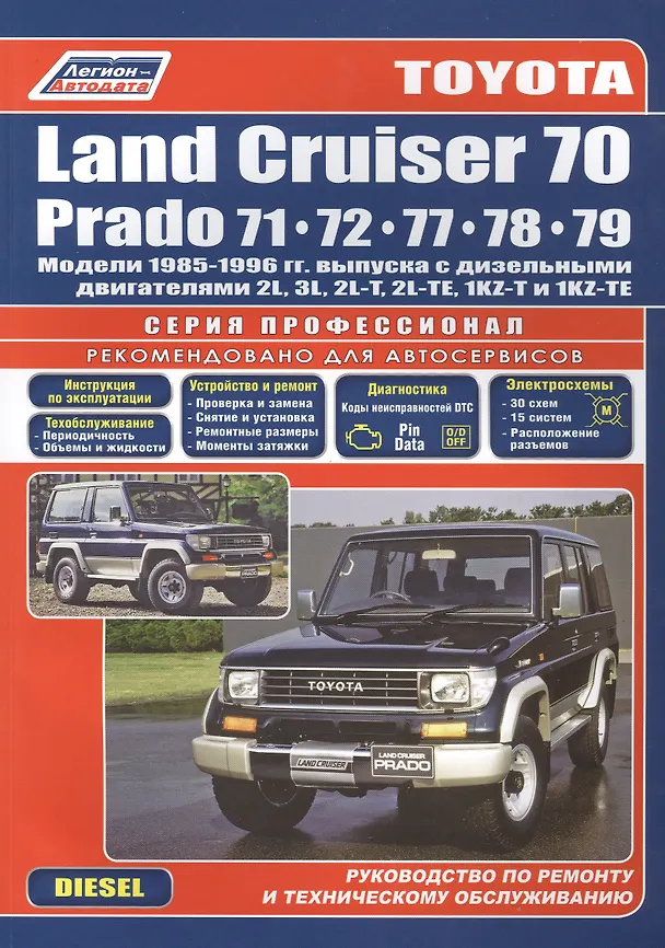 В руководстве дается пошаговое описание процедур по эксплуатации, ремонту и техническому обслуживанию автомобилей Toyota Land Cruiser 70 Prado (в т.ч. 71/72/77/78/79) 1985-1996 гг. выпуска с правосторонним и левосторонним рулевым управлением, оборудованных дизельными двигателями 2L (2,5 л), 3L (2,8 л), 2L-T (2,5 л с турбонаддувом), 2L-TE (2,5 л с турбонаддувом и электронной системой управления двигателем), 1KZ-T (3,0 л с турбонаддувом) и 1KZ-TE (3,0 л с турбонаддувом и электронной системой управления двигателем).