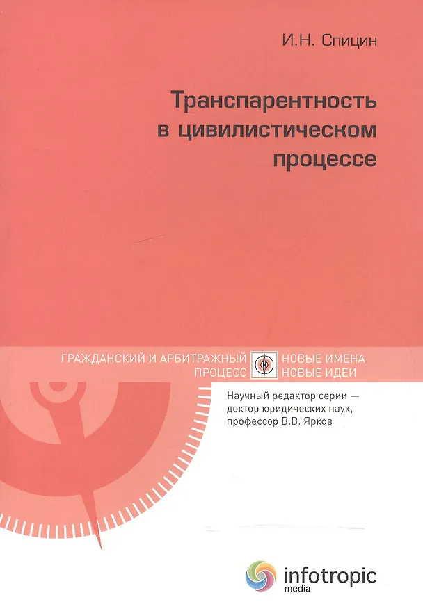Книга посвящена проблемам открытости судебной власти. Работа И.Н. Спицина чрезвычайно актуальна и интересна своей новизной. Выводы и предложения автор основывает на современных тенденциях международного гражданского процесса, судебной практики национальных и международных судебных органов, предлагает собственное многоаспектное понятие транспарентности, конструирует модель механизма обеспечения транспарентности в цивилистическом судебном процессе путем выявления, структурирования и систематизации обеспечительных средств, исследует обеспечительный потенциал процессуально-правовых элементов механизма и др.Сформулированные автором положения могут быть использованы не только в рамках цивилистичес