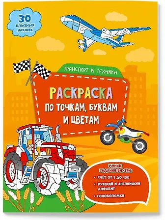 С раскраской по точкам, буквам и цветам «Транспорт и техника» обычное раскрашивание превратится в увлекательное приключение! Разгадай головоломки и расшифруй цветовые коды, повтори русский и английский алфавит и счёт до 100! Соединяй точки, штрихуй и раскрашивай! Красочные мотивирующие наклейки помогут оценить работу ребенка: для этого на каждой страничке с заданием есть специальное окошко. Каждый разворот - новое задание с интересным, увлекательным сюжетом! Создай свой яркий мир транспорта и техники!