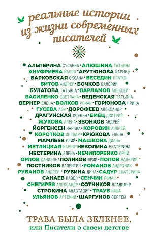 Трава была зеленее или Писатели о своем детстве. Хотя бы одна занимательная история была в детсве у всех, и все ее потом рассказывают. А в этой книге подобные яркие истории рассказывают писатели- то есть те люди, которые владеют этим искусством- красиво и живо рассказать. ПРочитала с удовольствием, по ходу чнения тоже навспоминала, списалась с подружкой, которая кое в чем участвовала- посмеялись. Настроение отличное.