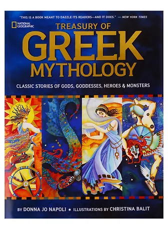 The new National Geographic Treasury of Greek Mythology offers timeless stories of Greek myths in a beautiful new volume. Brought to life with lyrical text by award-winning author Donna Jo Napoli and stunning artwork by award-winning illustrator Christina Balit, the tales of gods and goddesses such as Zeus, Aphrodite, Apollo, and Athena and heroes and monsters such as Helen of Troy, Perseus, and Medusa will fascinate and engage childrenβs imaginations.National Geographic completes the book with embellishments of each story: sidebars for each god, goddess, hero, and monster link the myths to constellations, geography, history, and culture to help young readers connect the stories to real life