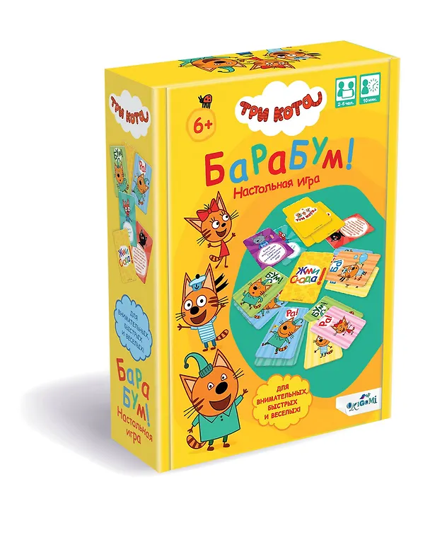 Коржик, Карамелька и Компот собрались с друзьями и семьей, чтобы сыграть в "БаРаБум"! Состязайтесь в этой азартной игре на скорость, реакцию и внимательность. Первый, кто заметит одинаковые картинки и нажмет на карту, забирает все! Но будьте начеку: кто ошибется, того ждет особое задание. Смех и неугомонное веселье в любой компании обеспечены!