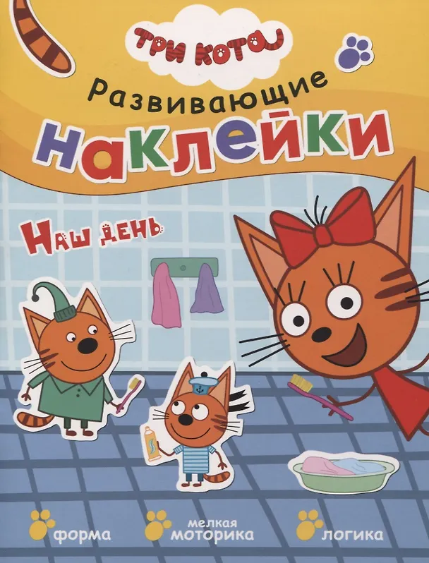 .Благодаря удобному формату заниматься по книге «Наш день» из серии «Три кота. Развивающие наклейки» можно где угодно: дома, в поездке, гостях и на прогулке.
