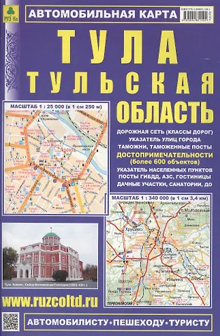 Вашему вниманию предлагается автомобильная карта дорог Тульской области и Тулы. На карте представлены: дорожная сеть (класс дорог), километровые знаки, указатели населенных пунктов, указатели улиц города, АЗС, автосервисы, гостиницы, кафе, рынки, памятники архитектуры. Масштаб карты Тульской области: 1:340 000Масштаб карты Тулы: 1: 25 000