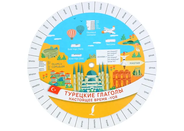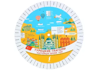 Диск-вертушка "Турецкие глаголы. Настоящее время -yor" — компактный помощник в изучении турецкого языка! С данным наглядным пособием вы легко и быстро выучите 30 основных глаголов турецкого языка и то, как они видоизменяются в зависимости от формы предложения, а также узнаете перевод и формы повелительного наклонения на "ты" и на "Вы".