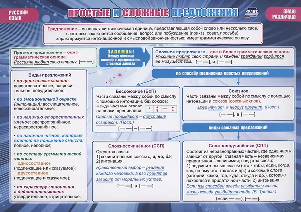 Учебные плакаты. Русский язык. Простые и сложные предложения