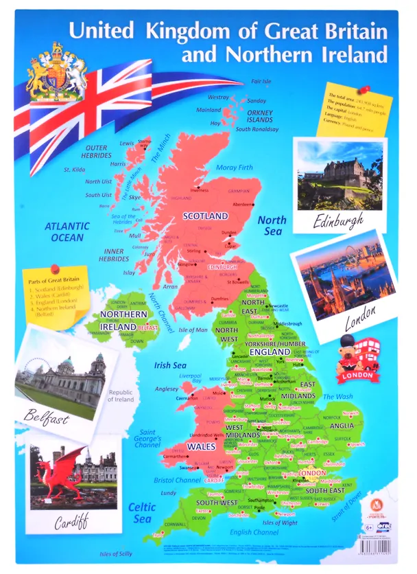 Представленный плакат - это возможность для педагога наглядно познакомить обучающихся с графическим изображением Великобритании на карте мира, с основными характеристиками страны, с административным делением на регионы и самыми известными достопримечательностями. Такой способ подачи материала будет способствовать поддержанию интереса к предмету, расширению кругозора школьников, развитию иноязычной коммуникативной и социокультурной компетенции и навыков самообразования. Предназначено учителям иностранного языка, педагогам дополнительного образования.