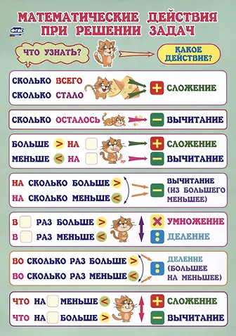 Учебный плакат "Математические действия при решении задач" адресован младшим школьникам и поможет им решать текстовые задачи на сложение, вычитание, умножение и деление, научит определять, какие математические действия нужно использовать, чтобы решить задачу (раскрыть связи между данными и искомыми, отношения, заданные условием задачи, на основе чего выбрать, а затем и выполнить одно или несколько действий и ответить на вопрос задачи); использовать математическую терминологию при выполнении действий. Содержание плаката соответствует требованиям ФГОС НОО и применим ко всем действующим программам начального общего образования.