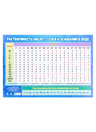Современный плакат - обязательный атрибут каждого специализированного учебного кабинета. Справочные материалы плаката помогут школьникам 8-11 классов освоить содержание школьной программы в соответствии с положениями ФГОС по предмету "Химия". Плакат "Растворимость кислот, солей и оснований в воде" поможет школьникам освоить химические основы, сделать процесс обучения более наглядным, запоминающимся, а значит, эффективным. Плакат наглядно демонстрирует возможную растворимость разных веществ в воде. Чтобы найти необходимые сведения на плакате, не нужно тратить много времени, достаточно найти на пересечении двух клеток требуемый символ и расшифровать его. Ряд напряжений используется на практике