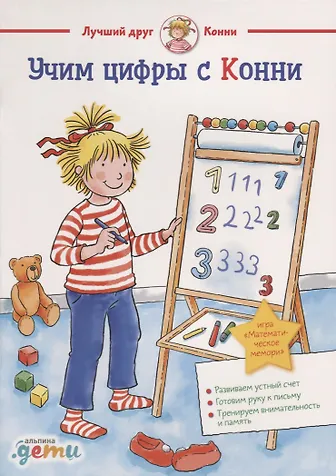 Первые шаги в математике совсем не страшны, если делать их с друзьями. Вместе с Конни учимся считать и писать от 1 до 10. Раскраски, рисунки по точкам и лабиринты помогут подготовить руку малыша к письму, развить внимание и логическое мышление. Бонус — игра «Математическое мемори».