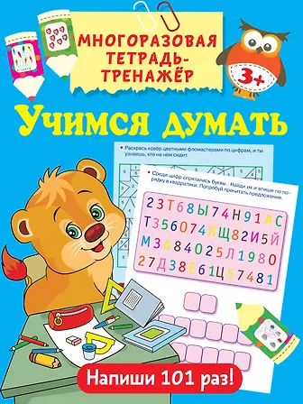 "Учимся думать" - многоразовая рабочая тетрадь для будущего первоклассника. Весёлые задания помогут ребёнку научиться думать, анализировать, выстраивать логические цепочки, а также развить внимание, память, графические навыки, мелкую. Благодаря специальному покрытию страниц линии можно проводить много раз маркером на водной основе и аккуратно стирать, чтобы исправить ошибку.