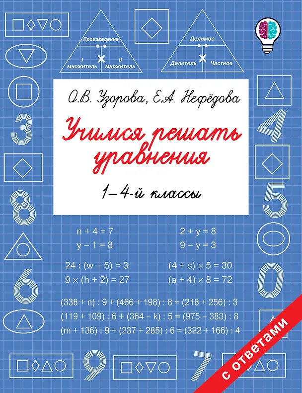 Новое пособие, основанное на уникальной методике известных педагогов-практиков О. В. Узоровой и Е. А. Нефёдовой, поможет школьнику автоматизировать навык решения простых и сложных уравнений. Оригинальные и увлекательные задания на полях книги позволят развить мышление, внимание, память, математические способности ребёнка.