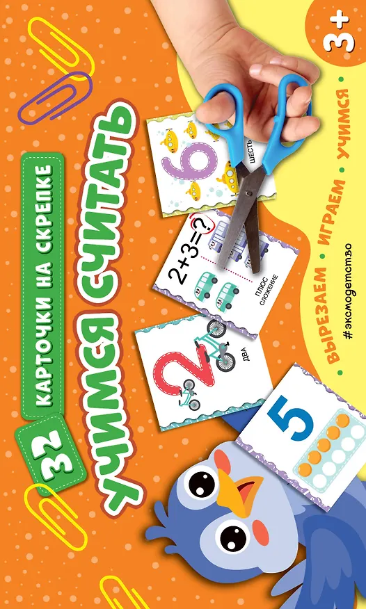 Необычное пособие для дошкольников поможет ребёнку от 3 лет научиться считать. При помощи ножниц книга превращается в комплект из 32 двусторонних обучающих карточек. Перемешайте их и предложите дошкольнику самостоятельно выбрать какую-то одну. Назовите цифру и вместе с ребёнком сосчитайте предметы, которые она обозначает. На карточках с арифметическими знаками наглядная инструкция по их применению, которую можно использовать как памятку. Выкладывая карточки на ровной поверхности, тренируйтесь выполнять действия сложения, вычитания, сравнения. Пособие можно использовать как для домашнего обучения, так и в детском саду. Книга для детей поможет дошкольнику сделать первые шаги в освоении математ