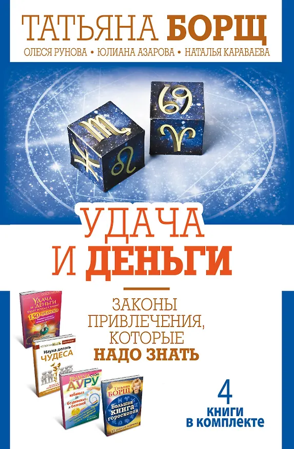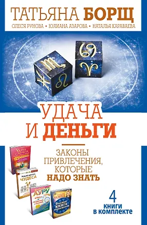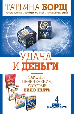 "В этом комплекте четыре книги замечательных авторов и среди них знаменитого астролога – Татьяны Борщ. Эти книги научат вас привлекать удачу и деньги. Вы узнаете, что сулит вам гороскоп, как привлекать деньги и при помощи древнего искусства фэншуй, что советую психологи, чтобы стать богача и и достичь успеха.