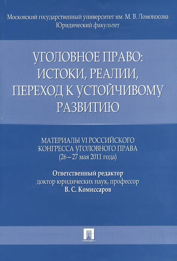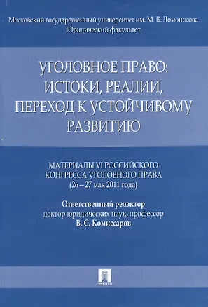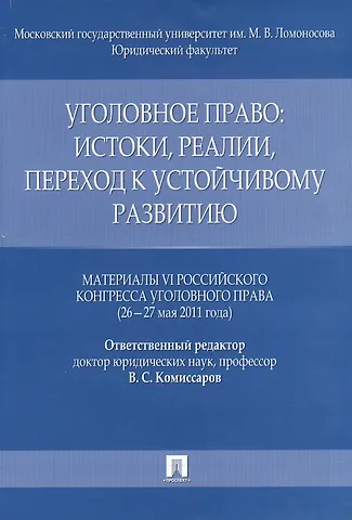 Настоящее издание представляет собой сборник статей по материалам VI Российского конгресса уголовного права «Уголовное право: истоки, реалии, переход к устойчивому развитию», проходившего на юридическом факультете МГУ им. М. В. Ломоносова 26-27 мая 2011 года. VI Российский конгресс был посвящен памяти профессора кафедры уголовного права и криминологии МГУ им. М. В. Ломоносова, доктора юридических наук, заслуженного деятеля науки РСФСФ, лауреата Государственной премии СССР Нинель Федоровны Кузнецовой. Сборник включает статьи ведущих российских и зарубежных юристов — научных и практических работников, преподавателей высших учебных заведений. Для студентов, аспирантов, преподавателей юридически