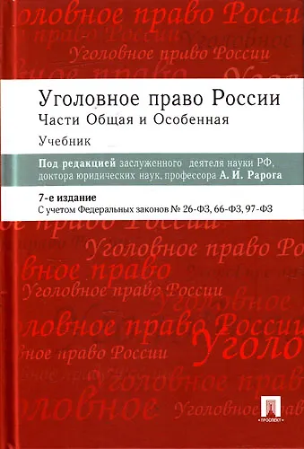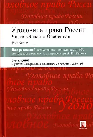 Предлагаемая книга объединяет ранее неоднократно переиздававшиеся учебники по частям Общей и Особенной уголовного права и является седьмым изданием, переработанным и дополненным в соответствии с новейшими изменениями и дополнениями законов и нормативных актов, раскрывающих содержание его бланкетных норм (с учетом Федеральных законов №26-ФЗ, 66-ФЗ, 97-ФЗ). Издание подготовлено в соответствии с программой курса "Уголовное право" специальности "Юриспруденция", на основе современных научных концепций и правоприменительной практики. Для студентов, аспирантов, преподавателей высших учебных заведений, работников суда и правоохранительных органов.