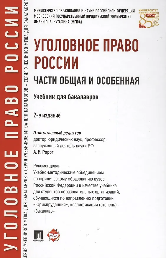Учебник «Уголовное право» под редакцией Рарога является классикой правовой литературы. Авторский коллектив подобрал и раскрыл материал так, что студенту легко его освоить. Тем более, в одном томе объеденены темы как общей, так и особенной частей уголовного права. Одного этого учебника будет достаточно для освоения курса и подготовки к экзаменам студентами юридического факультета