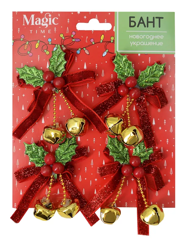 Ёлочное украшение «Бантики с бубенчиками» (артикул 95143) — это набор из 4 подвесных элементов из полиэстера размером 6×8 см. Оно предназначено для декора новогодней ёлки, окон или интерьера, создавая праздничную атмосферу.