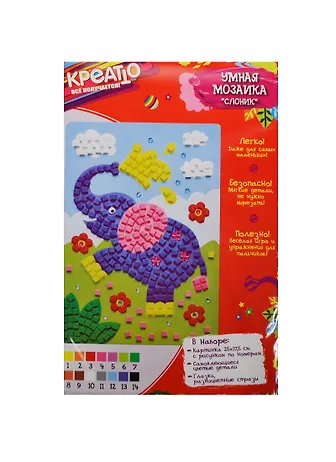 Умная мозаика – это легкое, полезное и безопасное развлечение для любого ребенка. Ее части созданы из мягкого, приятного на ощупь материала EVA с клеевым слоем, поэтому легко приклеиваются и прочно держатся. Их не надо вырезать – просто снимите с них защитную пленку и вклейте в контур рисунка в соответствии с номером цвета. Затем приклейте глазки и украсьте картинку блестящими стразами. У вас получится очаровательная объемная поделка, которую можно с гордостью поставить на самое видное место. А сама работа с аппликацией полезна для развития внимания, цветовосприятия и образного мышления, отлично тренирует мелкую моторику и координацию движений.