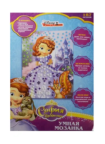 На красочной основе мозаики «София прекрасная» находятся выделенные места для размещения там 187 разнообразных пайеток и сверкающих страз. Картинка, изображающая юную принцессу Софию, итак вполне красива, а украшенная полимерными элементами, она станет еще более привлекательной. Все декоративные фигурки снабжены клеевым слоем, поэтому их нужно только отклеить от основы и поместить на подходящее место рисунка.