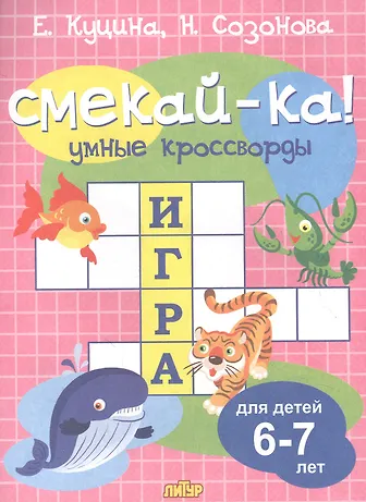 Замечательная книга. Скупила почти всю серию «Смекай-ка». В этой книге всего 14 кроссвордов. Вопросов к кроссворду нет, а только картинки и написанное слово по-вертикали (как на обложке). Нравятся крупные клеточки- 1,2 см. Кроссворды чередуются с различными заданиями- на каждой странице 1 кроссворд и 1 задание на общее развитие (кто лишний, найди пару). Кроссворды идут от простого к сложному. В первых кроссвордах слова покороче, в последующих подлиннее. Написанное слово по-вертикали стоит в разных места, может быть частью первых букв слов по-горизонтали.