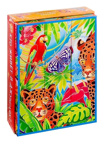 Набор состоит из 12 кубиков размером 4х4 см. Ребёнку нужно сложить картинку из 12 фрагментов. В качестве подсказки даны 6 картинок с изображением тропических животных. Картинка кладётся на дно коробочки, и ребёнок ставит на неё нужные кубики. Во время игр