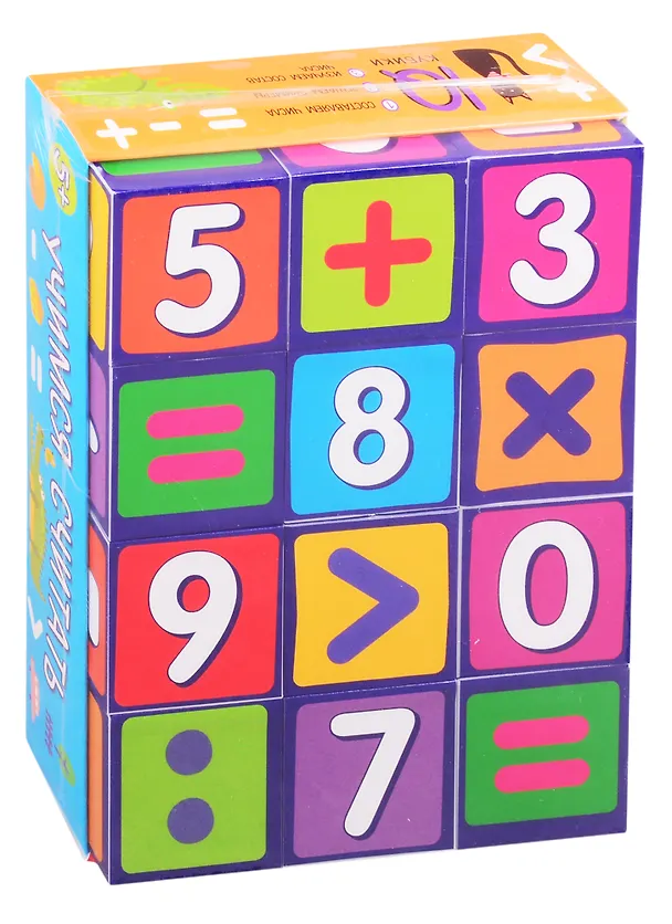 Набор состоит из 12 кубиков, на которых изображены цифры и математические знаки. На листовках даны различные математические задания, которые нужно выполнить с помощью кубиков. Ребёнок будет составлять числа, сравнивать их, решать примеры. Во время игры происходит развитие мышления, математических способностей, мелкой моторики. Наклейки на кубики сделаны из качественной гладкой бумаги, которая не портится от игры.