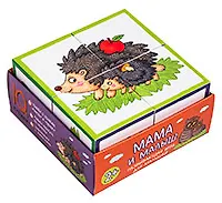 Набор состоит из 4 кубиков размером 4х4 см. Ребёнку нужно сложить картинку из 4 фрагментов. В качестве подсказки даны 6 картинок с изображением животных — мамы и малыша. Картинка кладётся на дно коробочки, и ребёнок ставит на неё нужные кубики. Во время игры происходит знакомство с понятиями «часть» и «целое», развивается умение работать по образцу. Наклейки на кубики сделаны из качественной гладкой бумаги, которая не портится от игры.