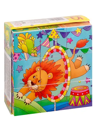 Комплект из 9 кубиков разработан специально для развития детей от 4 лет. Ребёнку нужно сложить картинку из 9 фрагментов. В качестве подсказки даны 6 картинок с изображениями из жизни цирка.