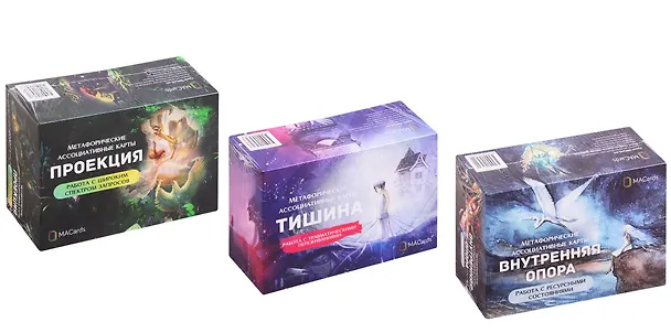 Универсальный МАК-комплект состоит из трех колод: универсальной (МАК «Проекция»), ресурсной (МАК «Внутренняя опора») и направленной на работу с травмой (МАК «Тишина»). Наличие этих базовых колод позволяет работать с любым запросом.
