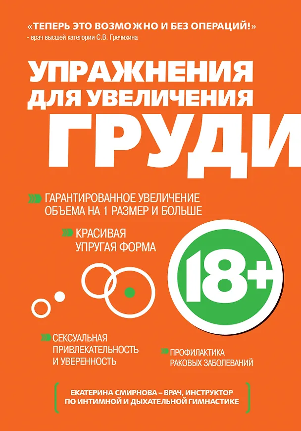 Каждая женщина мечтает об упругой груди красивой формы. Еще несколько лет назад на вопрос «Можно ли увеличить грудь, не прибегая к операции, сомнительным добавкам и тренажерам?» ты бы получила отрицательный ответ. Однако теперь Екатерина Смирнова, известный врач и инструктор, создала свою собственную уникальную методику. Благодаря этой гимнастике ты получишь грудь желаемого размера без проблем и затрат. Кроме того, в процессе тренировки грудных мышц ты улучшишь свое здоровье, приобретешь дополнительную привлекательность и сексуальность, разовьешь мощный иммунитет против инфекций и раковых заболеваний и пр.