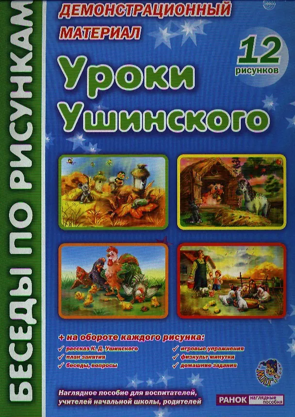 Уроки Ушинского. 12 рисунков, на обороте рассказ, план занятия, игровые упражнения: демонстрационный материал