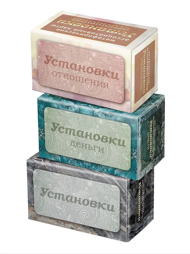 В набор входят три колоды: "Установки", "Установки: деньги", "Установки: отношения". Карты из набора помогут в работе с метафорическими ассоциативными картами в целях самопознания и психологической коррекции. "Установки" содержат положительные и отрицательные установки по отношению к себе, к окружающим людям, миру в целом. "Установки: деньги" содержат установки по отношению к деньгам и материальным ресурсам. "Установки: отношения" - женские установки по поводу личных отношений и создания семьи. Карты можно использовать как под руководством психолога, так и самостоятельно, в группе или в ходе индивидуальных занятий. В каждой колоде 105 карточек размером 7х4 см. Инструкции в комплекте.