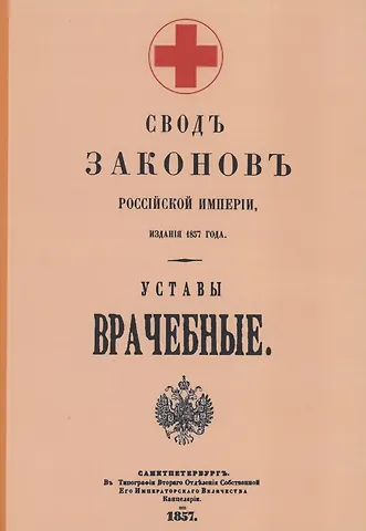 Репринт с издания. СПб., Свод Законов Российской Империи Том 13, 1857 г. Первый сформулированный врачебный устав в 3-х книгах (приведены полностью). Книга 1. - Учреждения врачебные: о врач, учреждениях, губ. врач. установлениях, губ. врачебных инспекторах и губ. ветеринарных управлениях, врачебном управлении в уездах и городах, врачебном управлении в губерниях и областях, о содержании, выдаваемом разным лицам медицинского и ветеринарного ведомств и о частной плате за лечение пациентов, о больничных заведениях управлении минеральными водами, об аптеках и фабриках, лабораториях и особых отделениях хим. заводов для производства и оптовой продажи фармацевтических препаратов, Книга 2. - "Устав ме
