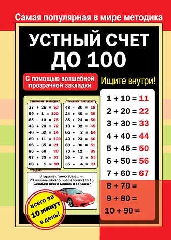 .Выполнение заданий поможет ребятам быстро и в краткие сроки овладеть навыками устного счета. В этой книге вы найдете примеры для устного счета до 100 и волшебную закладку, с помощью которой можно легко и быстро научиться считать в уме. На каждой страничке вы найдете примеры Вам всего лишь нужно закрыть закладкой ответы, и они исчезнут.