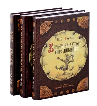 Комплект из 3 книг: «Вечера на хуторе близ Диканьки» Подарочное издание «Вечера на хуторе близ Диканьки» выпущено к годовщине смерти Николая Васильевича Гоголя. Сказочные иллюстрации Ивана Иванова погружают читателя в атмосферу «тихой украинской ночи». «Вий и другие повести из цикла „Миргород“» В книгу вошли самые любимые российским читателем произведения Н. В. Гоголя. «Вий» с леденящим душу сюжетом и колоритными персонажами, эпический «Тарас Бульба» и другие повести. Иван Иванов, который создал блестящие иллюстрации к «Вечерам на хуторе близ Диканьки» продолжил работу и над изданием «Вий и другие повести из цикла „Миргород“». «Портрет. Петербургские повести» Серия «Коллекция „Метаморфозы“»