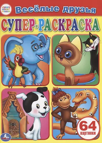 Раскраска "Веселые друзья" формата а4, большая, с белыми платными листами. Очень привлекло, что в ней будут герои союзмультфильм, а на деле в ней пол раскраски с героями "Котёнока по имени Гав" и "38 попугаев".