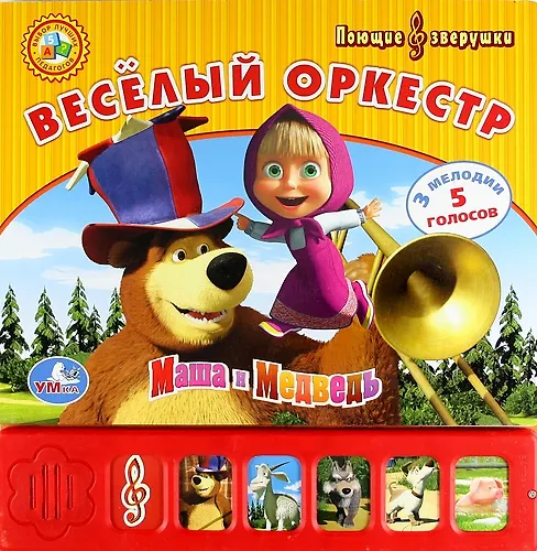 Красочная звуковая книга; В этой книге Маша руководит целым оркестром; Красивые иллюстрации; Звуковой модуль с 6 кнопками; 3 мелодии и 5 голосов; 16 картонных страниц; Материал: картон, пластик.