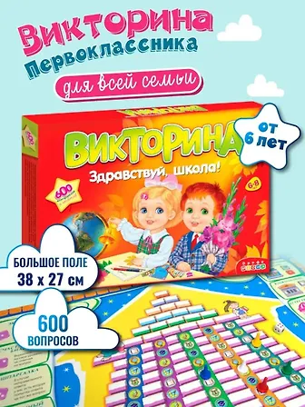 Купили в подарок на 1 сентября. Ребенку подарок понравился. Карточки делятся на три группы по сложности (желтые-легкие, оранжевые-средней сложности и красные- сложные) в каждой карточке 6 вопросов. Самые сложные мы пока убрали в сторону, пробовали играть желтыми и ораньжевыми. Игра расчитана на возраст от 6 до 8 лет, но уверенна интересно будет и более старшим детям.