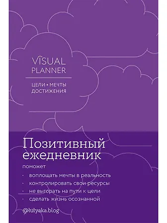 Авторский ежедневник Юлии Головиной (@lulyaka.blog) Visual Planner — для людей, которые ценят свое время, хотят жить счастливо и постоянно развиваться, но не потерять себя. Он поможет осознать истинные потребности, подобрать подходящий темп жизни и с комфортом двигаться к большим и маленьким результатам, не выгорая по дороге. Вы приобретете полезные привычки, научитесь осознанному планированию и рефлексии, чтобы изменения в жизни происходили бережно и под полным вашим контролем, справитесь с внутренним критиком и начнете с благодарностью относиться к себе и миру вокруг. В этом помогут блоки планирования на три месяца, месяц и каждый день, уникальное колесо баланса, трекеры настроения, достиж