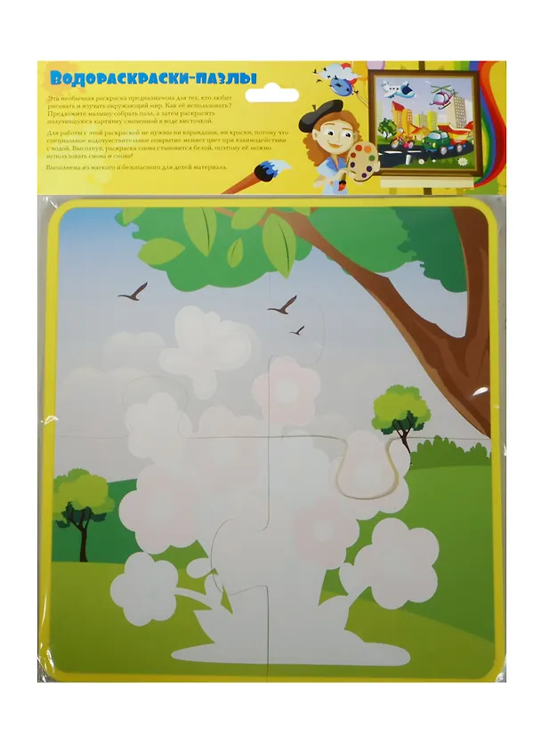 Эта необычная раскраска предназначена для тех, кто любит рисовать и изучать окружающий мир. Как её использовать? Предложите малышу собрать пазл, а затем раскрасить получившуюся картинку смоченной в воде кисточкой.