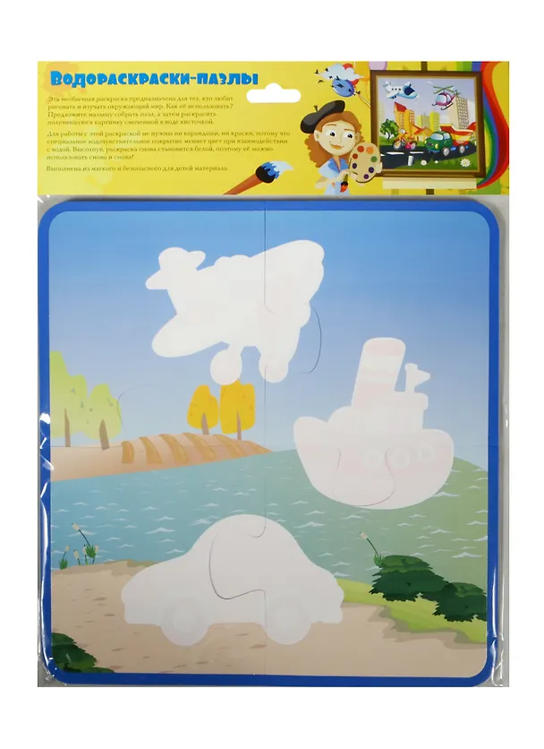 Эта необычная раскраска предназначена для тех, кто любит рисовать и изучать окружающий мир. Как её использовать? Предложите малышу собрать пазл, а затем раскрасить получившуюся картинку смоченной в воде кисточкой.
