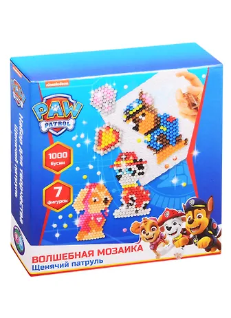 В наборе ТМ "Щенячий патруль" 1010 деталей: 1000 разноцветных бусин (диаметр бусин - 5 мм; каждый цвет в отдельном пакетике), 5 карточек-шаблонов со схемами 7-ми фигурок, 2 пластиковые основы, бутылочка-распылитель для воды, пинцет, цветная инструкция в картинках. Материалы: пластик, картон, металл. Товар сертифицирован. Упаковка: коробка (18