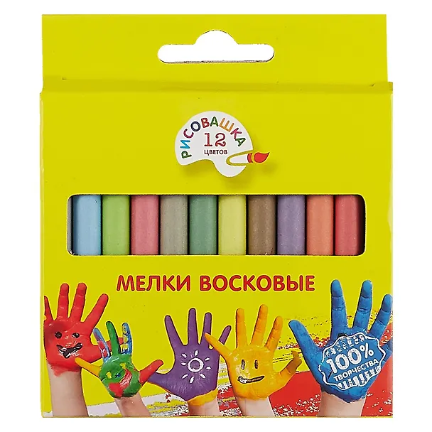 Мелки поставляются во всех цветах радуги + есть другие оттенки. Вся гамма цветов собрана для вас и ваших близких! 12 штучек мелков обернутых специальной бумагой в прочной картонной коробочке с открытой (видимой) частью для порядка и контроля.