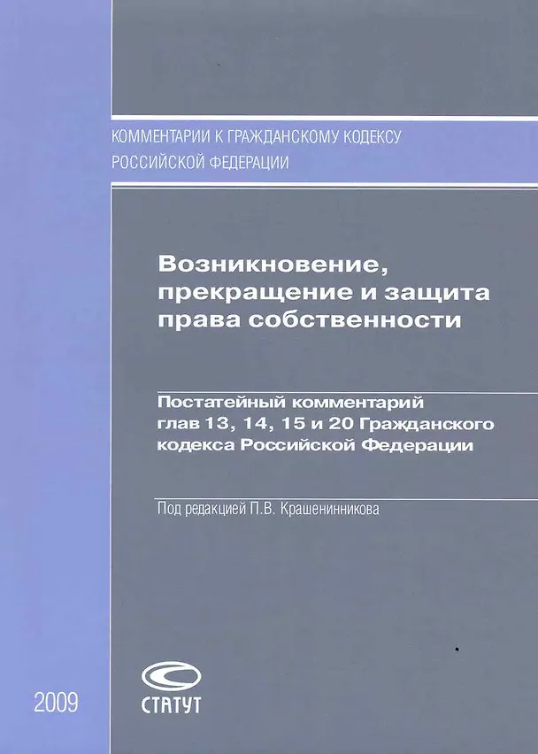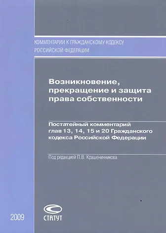 Крашенинников П. В. СТАТУТ Настоящее издание является очередной книгой в серии постатейных комментариев в отдельным главам Гражданского кодекса Российской Федерации (гл. 13, 14, 15 и 20 по состоянию на 1 октября 2009 г.). В комментарии рассматриваются вопросы возникновения, осуществления, прекращения и защиты права собственности. Издание предназначено для студентов, аспирантов, преподавателей юридических вузов, судей, адвокатов, нотариусов, предпринимателей. Комментарий будет полезен всем, кто интересуется своими правами и обязанностями.