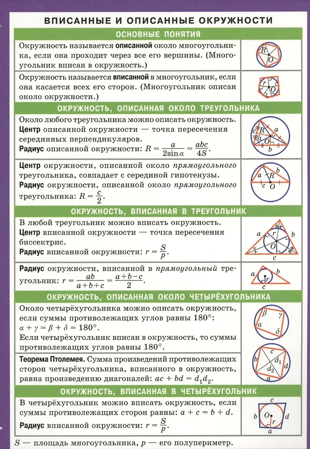 Наглядное пособие поможет закрепить и частично расширить сведения, полученные школьниками на уроках математики по теме "Вписанные и описанные окружности". Пособие отличают удобный формат и ёмкость изложения. Сжатые теоретические сведения и основные формулы помогут школьникам быстро сориентироваться в материале, проанализировать и выбрать верное решение задачи. Пособие будет полезно учащимся при подготовке к контрольным, самостоятельным работам и подготовке к ЕГЭ.
